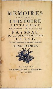 Mémoires pour servir à l'histoire littéraire des dix-sept provinces des Pays-Bas, de la Principauté de Liège, et de quelques contrées voisines. Ouvrage bio-bibliographique de base pour tous les collectionneurs de livres anciens. Ref. Barbier...