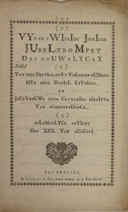 Bijgevoegd, 4 andere Brusselse religieuze gelegenheidsgedichten : Geluk-wenschinge van vader en moeder (…) aen hunnen soon (…) Joann: Thomas Mertens doende syn eerste misse (…) binnen Brussel den 6. January 1728. Brussel, N. Stryckwant, [1728]. -  Josué afgebeeldt in (…) Franciscus Jacobus Servaes (…) om te voltrecken syn eerste onbloedighe offerhande (…) binnen (…) Brussel op den derden junii 1731. Brussel, Z. Sanders, 1731. - Moyses (…) afghebelt in (…) Caellestinus Mertens, opklimmende van daegh tot den bergh des autaers (…) in (…) Affligem den VII. Januarii. Brussel, W.J. L. Marchant, [1753]. - De oprecht welgeregelde liefde, gedicht op (…) Suster Sr. Josina Servaes doende hare solemnele beloften op het vermaerde gasthuys van St Jan op den Poel in (…) Brussel den IX. Juny M.D.C.C.L.XI. Brussel, N. Jacobs, [1761]. Met "Liedekens", gedrukt in 2 kolommen met sierinitiaal en ornamenten. Nrs. 2-3 en 4-5 op stroken samengebonden (vouwen, randen soms rafelig, wormgaatjes). Overigens goede ex.