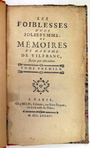 Les foiblesses d'une jolie-femme, ou Mémoires de Mme de Vilfranc, écrits par elle-même. Nouvelle édit. (originale 1776 ou 1779) de ce "roman assez érotique" (Gay-Lemonnyer), aussi attribué par certains bibliographes à Restif de La Bretonne....