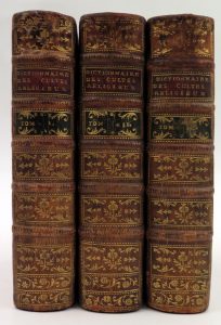 Nouv. édit. (orig. 1770), peu courante, de ce copieux dictionnaire embrassant le judaïsme, le christianisme, les églises grecque, abyssinienne, copte, arménienne, luthérienne, le paganisme, les religions des anciens Germains, Gaulois, Arabes..., des Parsis, Tartares, Chinois, Formosans, Tonquinois, Siamois, Japonais, Nègres, Hottentots, Américains... et enfin le "Mahométisme", cf. table des articles au début du t. I. Ill. (complet) de 4 jolies pl. dépliantes gravées sur cuivre, figurant des cultes extra européens (bonzes de la Chine, idolâtrie des Tartares orientaux avec représentation du Dalaï Lama, sacrifices humains chez les Mexicains et idolâtrie des Nègres de Guinée). Cachet répété de Julien Ries (1920-2013), prêtre catholique belge, créé cardinal par Benoît XVI, anthropologue et historien des religions de renommée internationale; professeur à l'université de Louvain, il y fonda le Centre d'histoire des religions. Il développa l'idée de l'"Homo religiosus" de l'anthropologie religieuse.