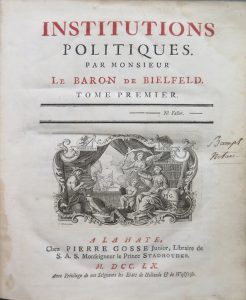 Rare complete set (the 3rd vol. printed 12 years later after the death of the author is almost always lacking) of the major work of the German politician and writer Bielfeld (1717-1770). “Traité populationniste qui eut une grande influence en France et qui rencontra l’approche des mercantilistes. L’auteur se montre favorable à la liberté économique, au développement des colonies, à condition qu’elles accèdent rapidement à leur indépendance, et préconise une lutte institutionnelle contre la pauvreté et contre les freins à l’accroissement démographique. Dans un chapitre intitulé: Des calculs politiques, Bielfeld définit son objet et retrace l’histoire de l’arithmétique politique de Graunt et Petty à Süssmilch en passant par les "calculateurs" français, anglais et suédois (...) Une grande partie de l’ouvrage est consacré à l’économie et aux finances: De l’opulence de l’état en général; Des finances; Des manufactures; Du commerce; De la navigation; Des forces de l’État etc.” (Giard/Scritti). Ill. with an engr. front. portrait by J. Houbraken, dated "1759"; engr. headpcs. Engr. mark on title. Titles in red & black. Old ownership entry on title "Bamps", a Hasselt notary public and collector. Bookseller’s stamp.