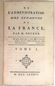 De l'administration des finances de la France.  Emission ou contrefaçon de l'édit. orig. de cet important traité, rédigé alors que Jacques Necker subissait sa première disgrâce : en effet, le financier suisse (1732-1804) avait été directeur...