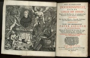 Rare Dutch translation of one of the moralizing works by the famous preacher Abraham a Sancta Clara (Johann Ulrich Megerle, 1642-1709). Ill. with a folding engraved frontispiece and 70 woodcut emblems. Title in red and black.