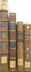 Frossardus et Cominaeus duo nobilissimi gallicarum rerum scriptores. Amsterdam, J. & C. Blaeu, 1640. Edit. collective en latin des chroniques de J. Froissart et Ph. de Commines. Titre-frontisp. gravé. Ex-libris Marquis de Gages à Mons. - Hénault, Charles-Jean-François - Nouvel abrégé chronologique de l'histoire de France (...). Nouv. éd. (...). Rouen, Vve P. Dumesnil, 1789, 3 vol. - Id. - [Même titre] continué (...) par A.-E.-N. Des Odoards-Fantin. Paris, Briand, 1788, 2 vol. -  Duclos, Charles - Histoire de Louis XI. Paris, Frères Guérin, 1745, 3 vol. Portrait-frontisp. - Id. - Recueil de pièces pour servir de suite à l'Histoire de Louis XI. Amsterdam, Neaulme, 1746. - Varillas, Antoine - Histoire de Louis XII. Paris, Cl. Barbin, 1688, 3 vol. - Id. - Histoire de François Premier. Paris, Cl. Barbin, 1685, 2 vol. - Gaillard, Gabriel-Henri - Histoire de François Premier (...). Nouv. éd. Paris, Foucault, 1819, 4 (sur 5) vol. Manque t. 4. - Motteville, Françoise de - Mémoires pour servir à l'histoire d'Anne d'Autriche, épouse de Louis XIII (...). Amsterdam, Changuion, 1750, 4 (sur 6) vol. Manquent t. 1 & 4. Provenance : famille princière belge.