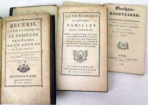 Joined : [Du Mont, J.] – Recueil généalogique des familles originaires de Pays-Bas ou y établies. Tome II. Rotterdam, [s.n.], 1775, 8vo, later cloth, gilt flat spine, blue sp. edges, [4]-411-[1] pp. (prel. f.2 with hole and wrongly bound, some spotting). Engr. coats-of-arms. Printed within ornamental border. Ref. STCN. Not in BL, BnF. - Goethals-kronyksken, of tydrekenkundige merkweerdigheden, betrekkelyk tot de leden van het Gendsch aloud edel geslacht der Goethals, uyt egte stuks getrokken, door T.A.L. Schellinck. Ghent, D.J. Vanderhaeghen, 1830, 8vo, cont. marbl. wr. (spine worn), 68 pp. Ref. Bibl. gant. 9669. (3 vol.)