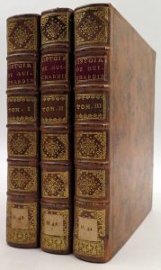 Edit. originale de cette trad. de "La historia d'Italia" (1561 sq.) par Favre, éditée par Georgeon. L'édit. originale de la traduction fut donnée en 1568 par Jérôme Chomedey et fut suivie de nombr. réimpressions. Cet ouvr. du diplomate et homme politique florentin Fr. Guicciardini (1483-1540) retrace avec impartialité les principaux événements survenus en Italie entre 1492 (mort de Laurent de Medicis) et 1534 (mort du pape Clément VII); il connut un grand succès dans l’Europe entière et fut souvent réimprimé et traduit en plusieurs langues. Provenance : famille princière belge.
