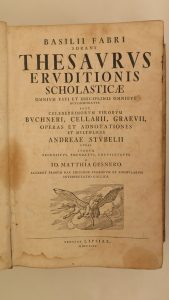 Thesaurus eruditionis scholasticae [ed. J.M. Gesner]. Later ed. of a popular Latin encyclopaedia (1st 1571) by the Lutheran schoolmaster B. Faber (1520-1576).