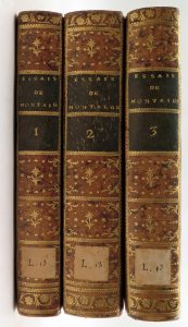 Nouvelle édit. donnée par le libraire, éditeur et polygraphe franc-maçon J.-Fr. Bastien (1747-1824), dans l'orthographe ancienne, volontairement "purgée" des notes et commentaires antérieurs et avec les passages en latin non traduits, cf. préface de l'éditeur qui justifie longuement ses choix. Portrait-frontisp. de Montaigne gravé par Noël Pruneau en tête du t. I qui contient aussi un court "précis" biographique. Table des matières in fine du t. III. Selon une note p. xvii du t. I, édit. tirée à 700 ex. dont 600 in-8. Provenance : famille princière belge.