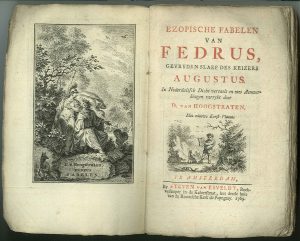Rare ed. of the Dutch adaptation of Phaedrus by D. van Hoogstraten (1658-1724), 1st publ. 1703. Engr. ills : front., title vignette, and 16 full-page pl. by S. Fokke with 96 small ills (erroneously numbered). Title in red and black.
