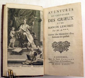 2e ou 3e édition séparée "qui paraît avoir été donnée par l'abbé Prévost lui-même et qui offre un texte correct" (Tchemerzine). Ex. sur bon vergé, complet du joli frontisp. allégorique n.s. L'édit. originale de cette "brève histoire d'amour, à bien des égards scandaleuse, publiée anonymement en Hollande et condamnée au feu en France" (En français...) avait été publiée en 1731 dans le t. VII des "Mémoires et avantures d'un homme de qualité". Mention ms. d'appart. "Ce livre appartient a Mr. le Marquis de la Guiche et a couté [non déchiffré] en janvier 1735". Provenance : famille princière belge.
