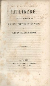On joint : La Ville de Mirmont, A.J.J. de - Le libéré. Tableau dramatique en cinq parties et en vers. Paris, Dufart, 1835, in-8, demi-veau de l'époque, plats de papier marbré, dos lisse orné doré (coiffe sup. défect.), xi-[1 bl.]-247 pp. (qqs pps fort brunies, rouss. et bruniss. passim). Seule édit. de ce rare ouvr. en vers dont l'action se déroule dans une maison de correction et qui traite du problème de la réinsertion des détenus, une fois leur peine accomplie. Dédic. aut.s. sur le faux titre. (2 vol.)