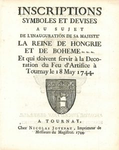 Inscriptions, symboles et devises au sujet de l’inauguration de sa Majesté la Reine de Hongrie & de Boheme (...) et qui doivent servir à la decoration du feu d’artifice à Tournay le 18 May 1744.