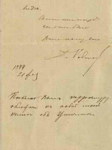 Rovinsky Dmitry (1824-1895) Lettre manuscrite de Rovinsky D. adressée à Ivan Kurisse, datée 1884. Une feuille in-8, texte 2 pp. Provenance : archive d’Ivan Kurisse. Kurisse Ivan Iraklievitch (1841-1898) - célèbre collectionneur (livres,