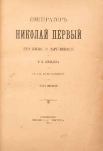 Schilder N. L’empereur Nicolas Premier. Sa vie et son règne. Saint-Pétersbourg, édition de Souvorine, 1903 Deux (2) forts volumes in-folio, reliures demi maroquin à 4 coins, dos à 5 nerfs titrés, têtes dorées, gardes en couleurs, marques
