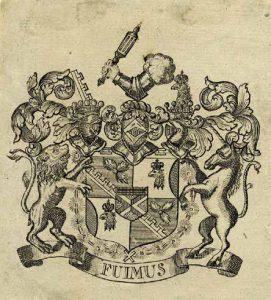Ex Libris De Yakov Brusse. Premier Ex Libris Russe Gravé. 10.3 cm x 9.1 cm, partiellement contrecollé sur carton, notes tapuscrites. D’après les notes tapuscrites de Khydoley : gravure sur cuivre, entre 1721-1725. Comporte au dos du montage