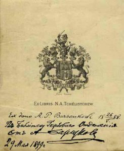 Ex Libris De N.A.Tchelistchew Et G.Tschertkoff. 1) 14, 5 cm x 9,4 cm, contrecollé sur papier noir (décollé). Comporte 2 inscriptions : «Ex dono A.P. Barsoukowi 18-26.5-88» et «A la bibliothèque de département des Armoiries de la part de A.