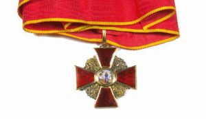 Insigne De L’ordre De Sainte Anne, 2ème Classe, Civil En or et émail, présenté avec son ruban. Porte les poinçons : 1) Ak (lettres russes) sous l’émail - atelier d’Albert Keybele. 2) titre 56, l’essayeur Ял (lettres russes) Jakov