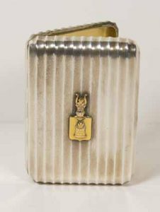 étui à Cigarettes, En argent et dorure. Couvercle comporte l’armoirie en applique, fermeture sertie d’un cabochon bleu foncé. L’intérieur - doré probablement postérieurement - comporte des noms russes gravés : Chtralborn O.K.