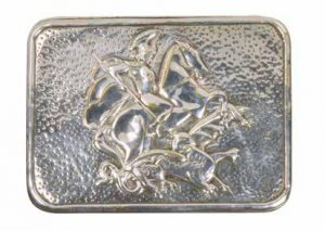 étui à Cigarettes, En métal argenté, couvercle orné du Saint Georges terrassant le dragon et à l’arrière d’un l’aigle bicéphale. Objet de fantaisie fait en période d’émigration, après 1923. Haut.: 7 cm - Long.: 9,4 cm - Larg.: 1,8 cm