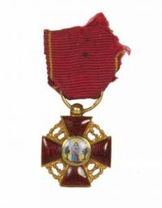 Insigne De L’ordre De Sainte Anne, En or et émail, modèle en réduction, présenté avec son ruban. Haut.: 1,3 cm - Poids brut : 1,4 gr