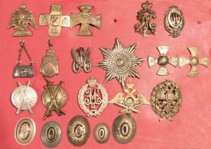 A M. A. Bourov» ; insigne de l’école d’artillerie ; les croix régimentaires etc. [Collection de V. Zweguintzow]