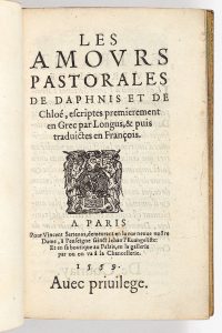 LONGUS. Les Amours pastorales de Daphnis et de Chloé, escriptes premierement en Grec par Longus, & puis traduictes en François [par Jacques Amyot]. Paris, Vincent Sertenas, 1559. In-8 de 83 ff. et (1) f. : maroquin citron, dos à nerfs, pièces de...