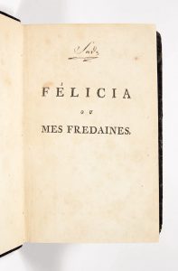 NERCIAT, André-Robert Andréa de. Félicia ou Mes fredaines. Sans lieu ni nom, 1792. 4 parties en 2 volumes petit in-8 de VII, 112 pp. ; (2) ff., 136 pp. ; (2) ff., 151 pp. ; (2) ff., 144 pp. (sans la table des chapitres de la quatrième et...