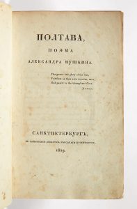 POUCHKINE, Alexandre Serguéiévitch. Poltava, poème [en russe]. Saint-Pétersbourg, Tip. Departam. narodnago prosvieshcheniia, 1829. In-8 de VII pp., (2) ff. et 91 pp. ; broché, couvertures de papier chamois imprimées et ornementées. Édition...