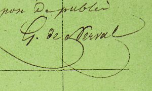elle offre la première trace autographe du fameux pseudonyme de Gérard Labrunie.