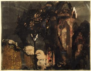HUGO, Victor. [Ruines gothiques]. Vers 1855. Dessin sur papier, 180 x 220 mm, non signé ; plume, lavis, à l'encre noire et à l'aquarelle, avec rehauts d’or et de gouache ; encadré sous verre. Superbe dessin original de Victor Hugo : il...