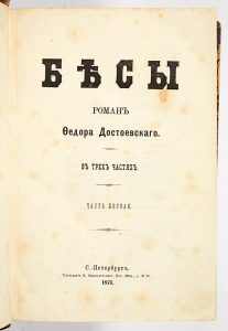 DOSTOIEVSKI, Fiodor Mikhaïlovitch. Les Démons [en russe : Bésy]. Saint-Pétersbourg, Typographie K. Zamyslovskago, 1873. 3 parties en un fort volume in-8 de (3) ff., 294 pp. ; (2) ff., 358 pp. ; (2) ff., 311 pp. ; demi-basane prune avec coins de...