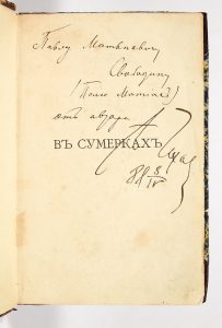 TCHEKHOV, Anton Pavlovitch. V sumerkakh. [Au crépuscule, ou Entre chien et loup, en russe]. Saint-Pétersbourg, Suvorina, 1887. Petit in-8 de (4) ff., 278 pp., 1 f. blanc et 8 pp. de catalogue de l'éditeur : demi-basane prune à coins, dos lisse...