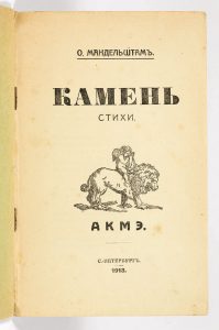 MANDELSTAM, Ossip. Kamen, stikhi [La Pierre, vers, en russe]. Saint-Pétersbourg, Acmé, 1913. In-12 : agrafé, couverture verte, premier plat orné d'une vignette répétée sur la page de titre (un angelot chevauchant un lion), chemise moderne...