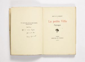 GOURMONT, Remy de. La Petite Ville. Paysages. Paris, Mercure de France, 1913. In-16, broché. Édition originale de ce recueil de courts textes en prose. Tirage unique à 150 exemplaires, dont 30 hors commerce (nº 47). Précieux envoi autographe...