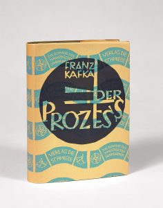 KAFKA, Franz. Der Prozess. Roman. Berlin, Verlag Die Schmiede, 1925. In-8 : toile verte à la Bradel, titre en bleu et rouge au dos et sur le premier plat, jaquette de papier crème décorée en bleu et noir, non rogné, tête jaune (reliure de...
