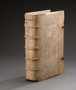 truie sur ais de bois estampée à froid, dos nerfs, fermoirs de laiton et lacets de cuir. 1278pp. Première édition avec les commentaires de Pamele archidiacre de Saint-Omer. Bel exemplaire dans sa reliure d'époque.