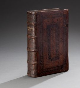 enarrationes,… per D. Joannem Lonicerum fidelissie in Latinum conversae…. Basilae, Andreas Cratander, sans date (1541 ?), puis 1540 ; 2 tomes reliés en un volume in-folio, veau brun de l'époque sur ais de bois, dos à nerfs, titre doré, avec au 1er plat décor de fleurons, arabesques, personnages allégoriques estampé à froid, et au 2ème plat décor de fleurs de lis, aigles impériales estampé à froid. Titre - frontispice gravé d'après Holbein, (3) ff., 220ff. ; (1) f. (titre orné d'une vignette), (9)ff., 285ff. (1) f. Initiales ornées, bandeaux, avec la marque de l'imprimeur au verso de chaque tome et au titre du 2ème. Le Privilège de Charles Quint est daté de 1536. Le beau titre frontispice gravé sur cuivre par Iacob Faber, d'après Holbein et signé I. F. dans laaaa ppplanche est un retirage du titre de la première édition du premier volume paru en 1524. La traduction du grec des Quatre Evangiles de Théophylacte est due à J. Occolampade , ami protestant d'Erasme et humaniste, elle est suivie des Commentaires sur les Epitres de Saint-Paul dans la traduction de Jean Lonicer , ami de Luther, professeur de grec et de théologie. Inscriptions manuscrites anciennes au titre à l'encre noire et mention manuscrite moderne à l'encre bleue en marge " achevé à Bale mars 1540" ; ex-libris cachet ancien. Traces de fermoirs (manquant), restaurations aux coins, coiffes et nerfs, quelques épidermures sur les plats, mouillure à quelques feuillets. Il manque les feuillets 217 et 218 du premier tome.