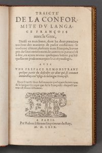 [LINGUISTIQUE] - ESTIENNE Henri. Traite de conformité du langage français avec le grec. Paris, Robert Estienne, 1569 ; petit in8, plein maroquin rouge, dos à nerfs, titre doré, filet doré sur les coupes, dentelle intérieure, tranches dorées,...
