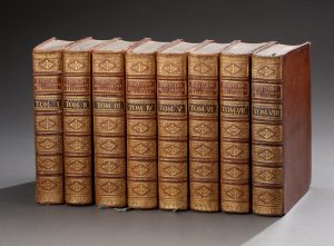leurs fondateurs…avec des figures qui représentent tus les différens habillements de ces Ordres et Congrégations. Paris, Nicolas, Gosselin, 1714-1719 ; 8 volumes in-4, plein veau fauve de l'époque, filet à froid encadrant les plats, dos à nerfs, caissons de filets et filets dentelés dorés, richement ornés de fleurons, petits fers dorés, titre doré sur étiquette de maroquin vieux rouge, tomaison sur étiquette de maroquin olive, tranches jaspées et peignées de bleu, les tranches en tête et queue sont dorées et ciselées aux coins et dans sur 7 cm en partant du dos Edition originale par les PP. Pierre Hélyot et Maximilien Bullot, illustrée de 806 planches gravées. Bel exemplaire très bien relié. Mouillures au Tome 8, angulaires et marginales au T.6, rares piqûres à l'eeeeennnsemble des volumes, des coins légèrement frottés.