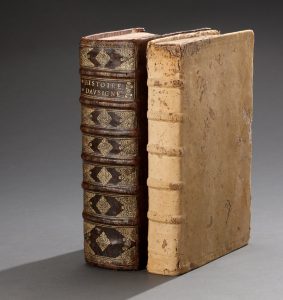 richement orné de larges fleurons dorés, titre doré, tranches rouges., 365 (-29), 549,(-15)pp. Epidermures et petits manques sur les plats, Mouillure claire à quelques feuillets du 1er tome, manque de papier au feuillet Y3 du tome 2, il manque au tome 3 les feuillets correspondant aux pages 469 à 549 et les 7 feuillets de table. On a joint dans une reliure en daim vert-jaune de l'époque le Tome 3 de 1620, comprenant tous les feuillets manquant à l'exemplaire précité (reliure en état médiocre, intérieur propre). Très rare édition originale (cf .Tchémerzine I, 163-164 et Stroehlin, 1037). Né en Saintonge, d'un père calviniste d'Aubigné, étudia très jeune, latin, grec et hébreu et se perfectionna à Genève auprès de Théodore de Bèze pour la théologie. Il entra au seeeervvvvice du Roi de Navarre, futur Henry IV. En opposition avec l'abjuration de son roi en 1593, il se retira dans ses terres de Maillé en Vendée. Il y créa une imprimerie avec l'aide d'un imprimeur de Niort, Moussat. Dès sa parution, son Histoire universelle déplut au pouvoir et fut condamnée à être brulée.