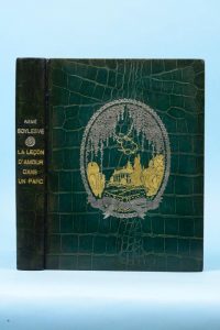 BOYLESVE (René). La Leçon d'amour dans un parc. Paris, Éditions Lapina, 1925. Grand in-8, basane verte imitant le crocodile, médaillon central sur les plats à l'or et au palladium figurant une maison dans un parc, dos lisse, tête dorée,...