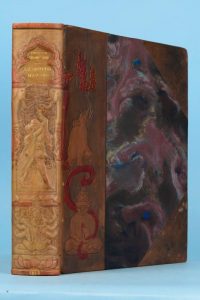 CHAMPSAUR (Félicien). Le Semeur d'amour. Paris, Fasquelle, 1924. In-4, demi-veau brun rehaussé de rouge avec coins, orné de boudhas et d'éléphants ciselés, dos orné d'une composition de cuir ciselé et repoussé figurant des ornementations...