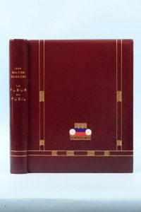 GALTIER-BOISSIÈRE (Jean). La Fleur au fusil. Paris, Les Bibliophiles du Crapouillot, Chez Pierre Trémois, 1946. In-folio, maroquin grenat orné de filets dorés et d'un rectangle de box bleu et rouge orné de deux disques blancs, dos lisse,...