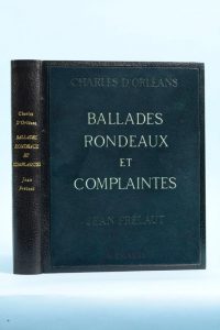 ORLÉANS (Charles d'). Ballades, rondeaux et complaintes. Paris, Lacourière, 1949. In-4, maroquin noir, plats en daim vert foncé, titre de l'ouvrage, noms de l'auteur et de l'artiste mosaïqués en veau vert foncé et tilleul, titre doré sur le...