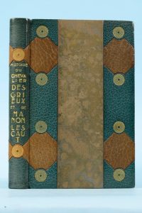 PRÉVOST (Abbé). Histoire du chevalier des Grieux et de Manon Lescaut. Paris, Helleu et Sergent, 1926. In-8, maroquin vert canard portant sur les deux plats des décors géométriques constitués d'une bande verticale de papier imprimé, de pièces...