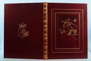 Édition illustrée de 7 bois gravés, d'un collage mis en couleurs, et d'un cuivre en couleurs gravé au diamant par Salvador Dalí. # Tirage à 475 exemplaires, celui-ci un des 8 exemplaires d'artiste sur japon nacré signés par Dalí comportant les 8 gravures, toutes signées par Salvador Dalí. # Il est accompagné d'une suite des 8 gravures imprimées en noir sur vélin de Rives, justifiées E.A. et signées par l'artiste. # Envoi autographe signé de l'artiste à Suzanne Navarre, orné d'un grand dessin original à double page. # Dos légèrement passé. #