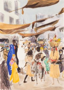 SANDOZ (Edouard Marcel). Vers l'Islam. Texte et croquis. Paris, Pierre Bricage, 1957; in-4 (24x29 cm), illustré de 100 aquarelles originales de Sandoz et accompagnant le texte, dont 17 hors texte et 11 de faune marine de la Mer rouge. en feuillets...
