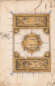 l'encre rouge. Titre frontispice enluminé dans deux cartouches et médaillon central à l'or sur fond bleu et rouge. Au colophon : terminé le samedi dizième jour du mois de Moharram l'an 978 (1562). Reliure orientale à rabat, plats et rabat estampés à froid. Trous de vers et manque de papier en marge des derniers cahiers, réparation à 3 folios en fin de volume et masquant du texte; coiffe supérieure abimé avec manque et trous de vers au dos; bel état de conservation général malgré ces menus défauts. - Shihab al-din Ibn Hadjar al-Askalani 1372-1449, historien égyptien dont l'œuvre principale constitue la somme finale de la science du hadith, fait de lui l'un des plus grands représentant de la science religieuse musulmane. Son commentaire du hadith commencé dans ses cours à partir de 1414 fut achevé en 1438. La renommée de l'ouvrage fut si grande que le souverain de Fârs, Shah Rukh demanda au souverain d'Egypte Barsbay de lui réserver des exemplaires; le hafcide Abu Faris Abd el Aziz, à l'autre bout du monde musulman en fit autant. Ses manuels constituent, encore aujourd'hui, des ouvrages indispensables pour les érudits.