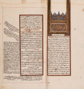 MUHAMMED FEKHI EL-AINI. Bahjat al-fatawa. (Traité de jurisprudence hanéfite). - Manuscrit en turc osmanli de (5)-248 folios; 31 lignes par page en écriture ta'liq, Les titres des questions et réponses en rouge dans un encadrement doré....