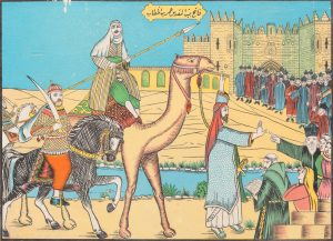 musulmane. Outre Noé et son épouse, il y a six patriarches à bord pour représenter l'espèce humaine. 35 x 25 cm sous verre, vers 1950. Figure N°3 de la nomenclature des 28 images religieuses publiés par l'imprimerie El Manar, recension d'Alain Bravo dans le Bulletin "Le Vieux Papier" fasc. 271 / 1979 2 - Image représentant le calife Omar ibn al-Khattab entrant à al-Quds (Jérusalem où il édifiera la mosquée qui porte son nom). Monté sur un chameau et accompagné de gardes à cheval, aux portes de la ville et en face les habitants l'accueillant. 32 x 24 cm; sous verre, vers 1950. Recension d'Alain Bravo N° 16. - Destinées à la décoration des habitations dans les milieux populaires ainsi qu'à celle de certains lieux publics, cafés, boutiques de barbiers, ces images ont une fonctions analogues à celle des fixés sur verre. A Tunis l'imprimerie El-Manar de M. Tidjani M'hammedi en a fait une spécialité.